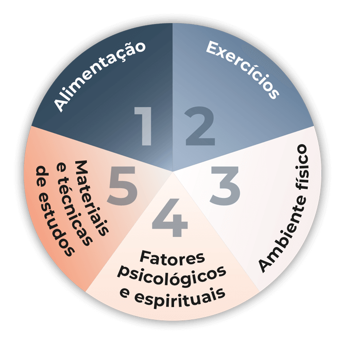 de cinco pilares fundamentais no processo de estudo: alimentação, exercícios, ambiente